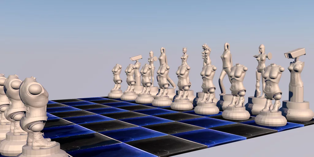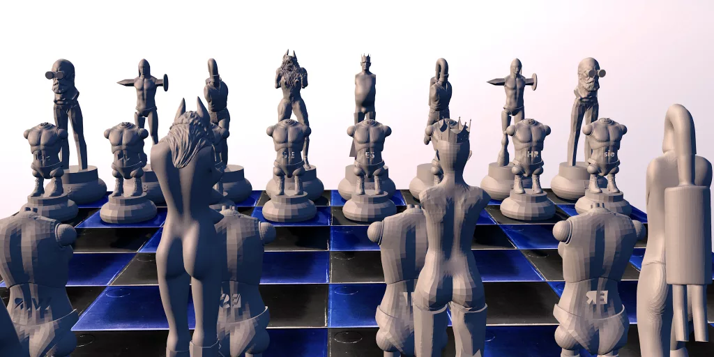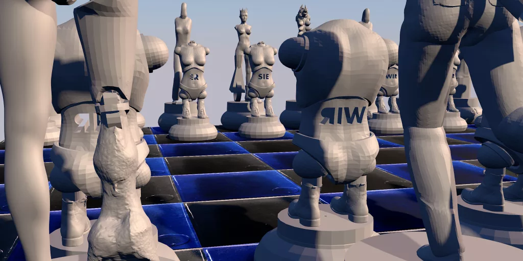 „Das Schachspiel des Lebens“ ist eine begehbare monumentale Skulptureninstallation in Bronze für den urbanen öffentlichen Raum. Die Figuren sind in ihrer Höhe gestaffelt (bis ca. 3,85 m) und stehen auf ihren jeweiligen Ausgangspositionen. Ein reales, begehbares Raster bildet das Feld und definiert die räumliche Ordnung der Installation. Konzipiert ist die Arbeit als dauerhaft erfahrbarer Raum, in dem Skulptur und Feldstruktur untrennbar miteinander verbunden sind. Visualisierungen sowie Maßstabsstudien liegen vor. Die Konzeption ist abgeschlossen.